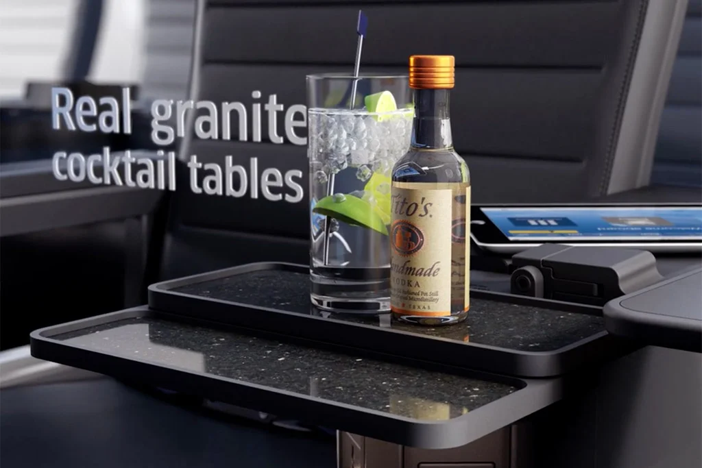 Our favorite features? The premium granite cocktail tables and the patented-design tray table featuring a tablet holder. Now your drink, food, and tablet all have their place.