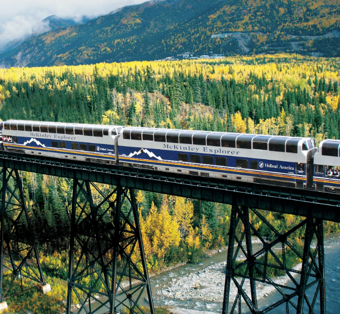 Travel in comfort on glass-domed railcars aboard the McKinley ExplorerⓇ and stay at Holland America’s McKinley Chalet Resort for an immersive wilderness experience. Enjoy a complimentary tour through Denali National Park & Preserve, the crown jewel of the interior, on select Alaska cruisetours, taking you inside the park that is home to North America’s tallest mountain.