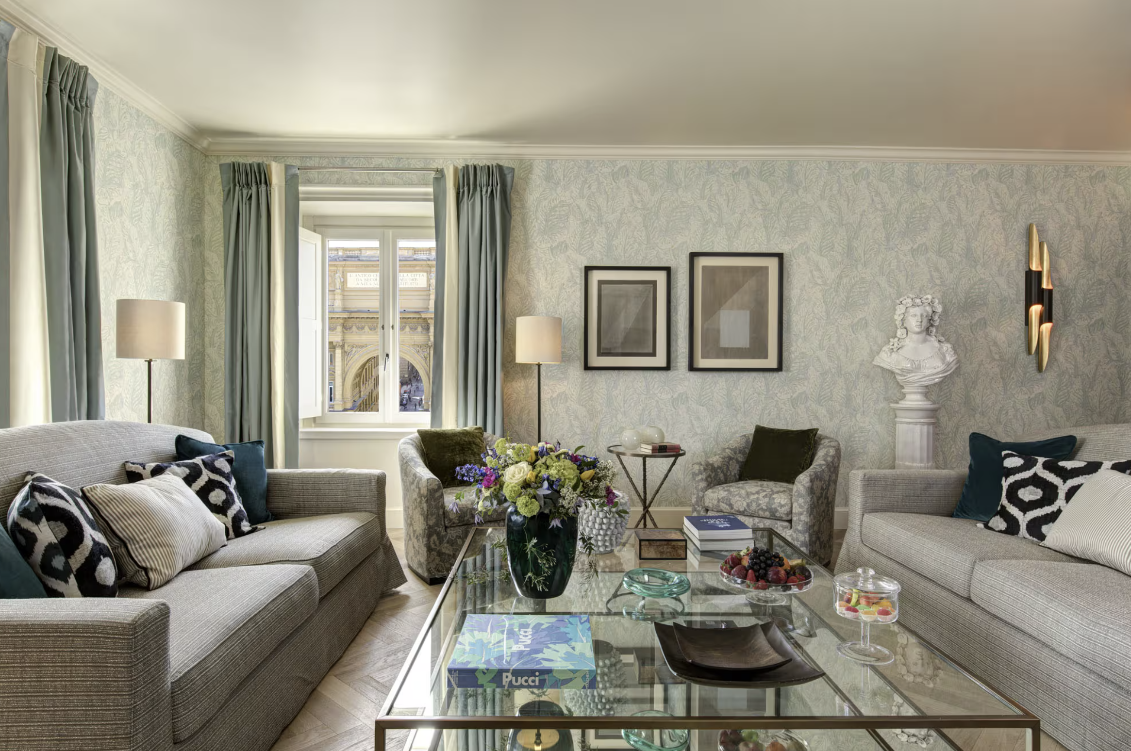 Overlooking the historic Piazza della Repubblica, relax in a spacious sitting room dressed in decadent textiles from celebrated brands like C&C and Dedar. There’s an in-room bar to pour a drink from, and a generous marble bathroom stocked with exclusive Irene Forte Skincare toiletries. At day’s end, a king-sized bed offers sublime comfort, promising restorative sleep before another night of sparkling Florentine entertainment—perhaps hosting friends in your private dining room, surrounded by inspiration at every turn.