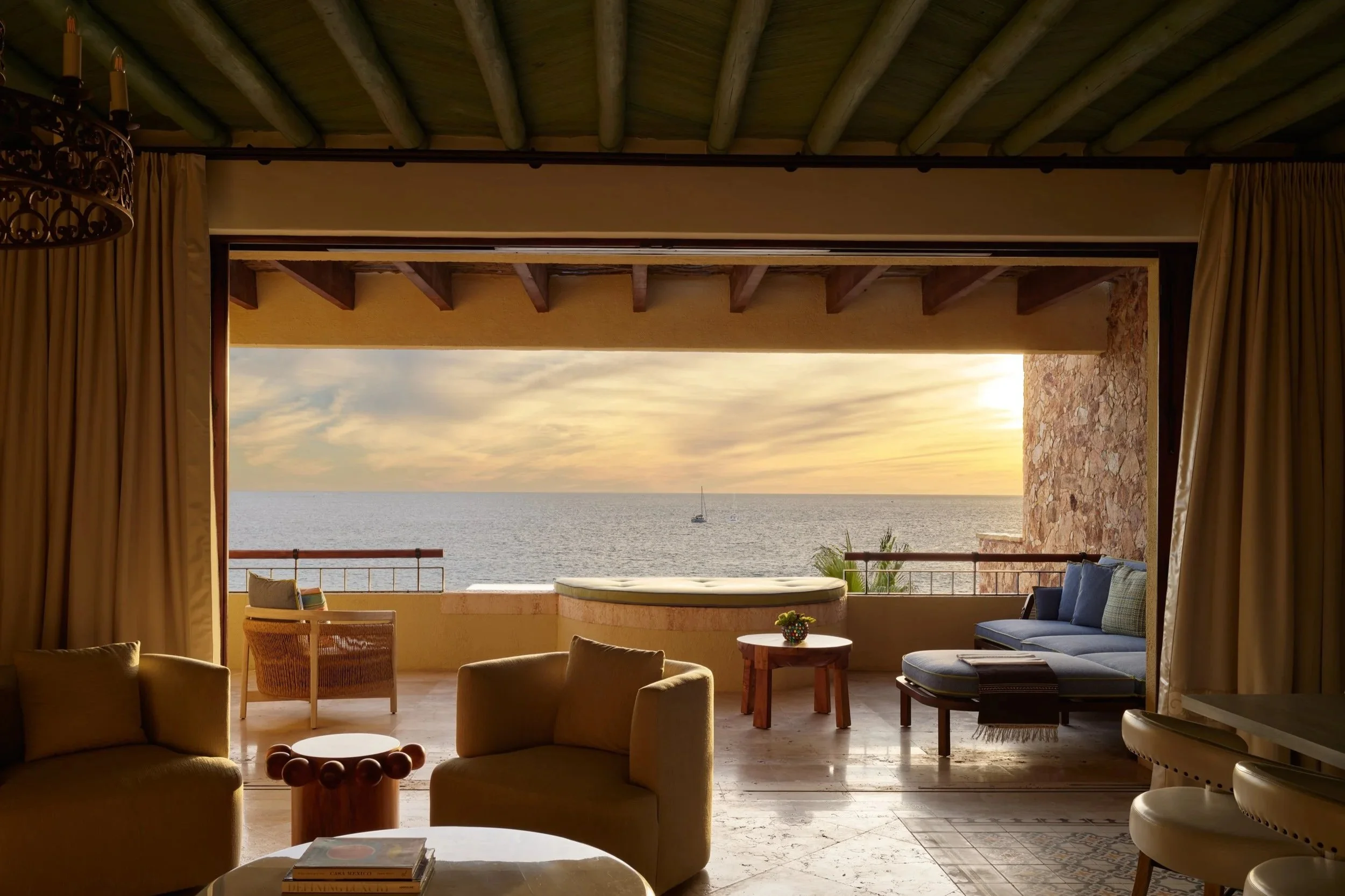 Mexican vendors and artisans were involved throughout the resort's renovation, resulting in rooms that celebrate the country's heritage, in a soothing palette of sandstone, honey, and jade that mirrors the cliffs and the sea. Artistic and handcrafted touches adorn each room and suite, from the metallic turtle-shell sculptures by Preciado Iluminación, a renowned studio in Jalisco, to sculptural sofas and hacienda-style woodwork.